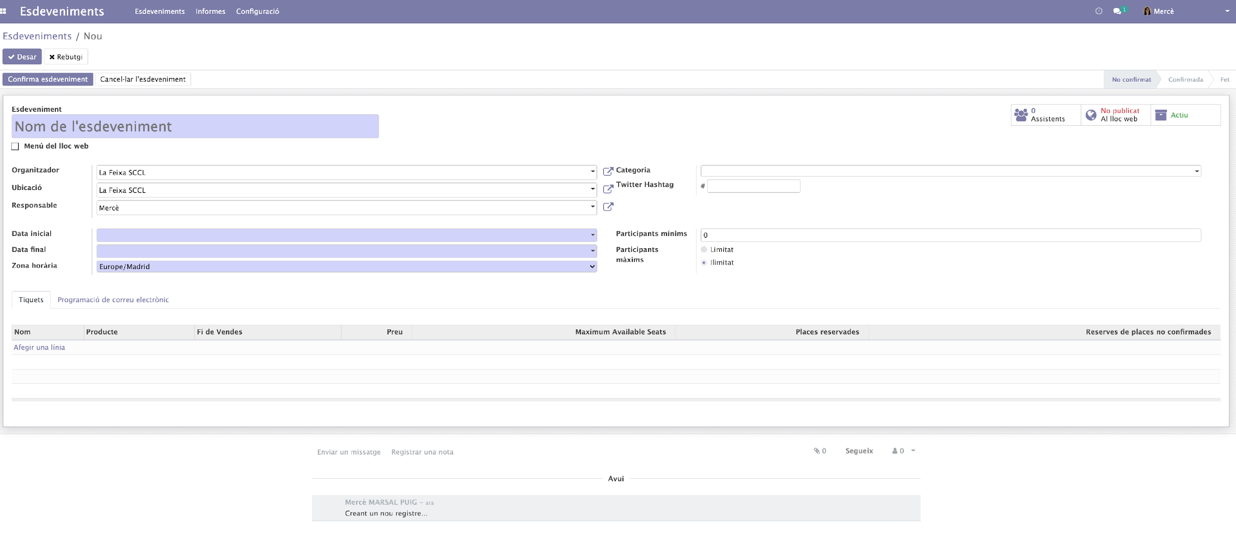 (Pas 1) Anar a la pàgina http://erp.lafeixa.cat/ i identificar-se. (Pas 2) Desplegar el menú superior esquerre “Lloc web”, i clicar Esdeveniments”. (Pas 3) Clicar el botó “+Crear”. (Pas 4) Ens surt el següent formulari: Seguim